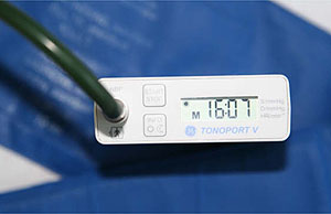 Ein automatisches Blutdruckmessgerät, das am Oberarm befestigt wird, registriert den Blutdruck in bestimmten Intervallen. Die Werte werden über einen Rekorder gespeichert und können den Tagesaktivitäten zugeordnet werden.